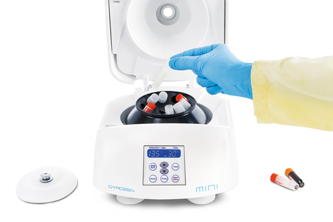 Gyrozen Micro Centrífuga refrigerada por aire (blanca). Velocidad máxima 13 500 rpm. 12 300 g (110 V, 50/60 Hz). Incluye rotor de ángulo fijo. 12 adaptadores de 1,5/2,0 y 0,2 ml.